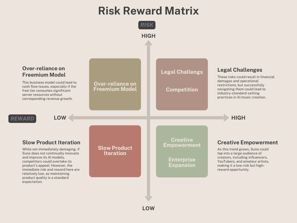 Legal Risks: The most significant risk facing Suno is potential litigation over copyright infringement. As an AI-driven platform that trains on large datasets, there is a high risk of being sued by music labels for using copyrighted materials without proper licensing. In 2024, the Recording Industry Association of America (RIAA) filed a lawsuit against Suno, raising concerns about the legality of its training methods.