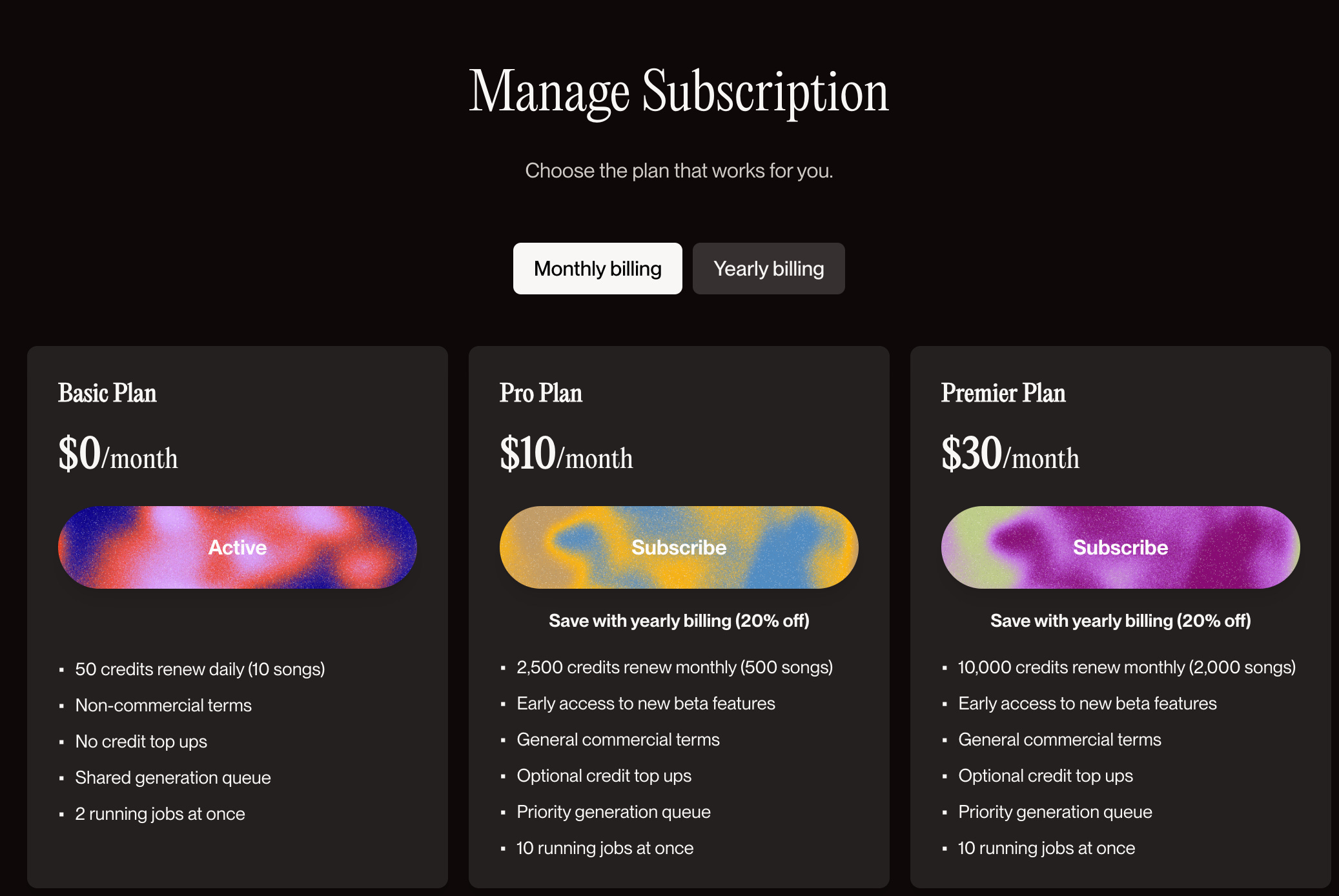 Suno operates a freemium subscription model, where users can access a limited number of song generations for free, but must pay for expanded access and additional features. The subscription tiers unlock more song creation, advanced editing tools, and commercial licenses for users looking to monetize their music.
